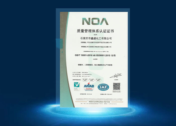 Xin Sheng telah diakui sebagai "perusahaan berteknologi tinggi", "Perusahaan kecil dan menengah berorientasi sains dan teknologi Provinsi Hebei","perusahaan baru khusus dan khusus" dan perusahaan maju lainnya, dan telah mengembangkan 6 produk baru dan 16 teknologi baru.pengalaman yang kaya dalam produksi pigmen anti korosi yang ramah lingkungan, dengan jalur produksi fosfat profesional, mengutip reaksi canggih, pengeringan, menghancurkan, mengisi dan peralatan lainnya, untuk mencapai otomatisasi teknologi tinggi dari peralatan, produksi cerdas,Standar manufaktur lebih ketat, proses lebih halus, kinerja produk lebih baik. kapasitas produksi tahunan adalah 3000 ton zinc fosfat seri,3600 ton seri aluminium tripolyphosphate dan 1500 ton seri aluminium phosphate. Kami memiliki tiga sistem sertifikasi utama (ISO9001, ISO14001, ISO45001), yang sesuai dengan sertifikasi Uni Eropa REACH pendaftaran, persyaratan standar ROHS, melalui pengujian SGS.Produk perusahaan kami dijual di seluruh negeri dan diekspor ke luar negeri, diekspor ke Asia Tenggara dan Eropa.